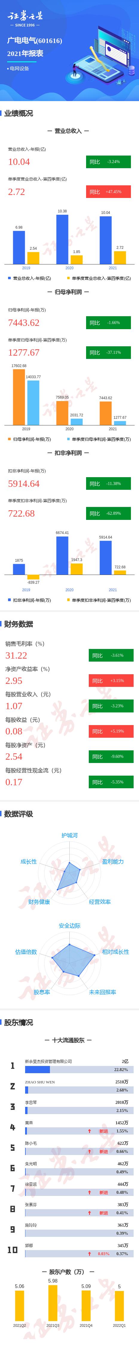 广电电气2022一季报显示,公司主营收入2.36亿元,同比上升3.31%;归母净利润1292.87万元,同比下降17.01%;扣非净利润1228.02万元,同比下降11.97%;其中2022年第一季度,公司单季度主营收入2.36亿元,同比上升3.31%;单季度归母净利润1292.87万元,同比下降17.01%;单季度扣非净利润1228.02万元,同比下降11.97%;负债率17.57%,投资收益286.85万元,财务费用-26.0万元,毛利率29.45%。