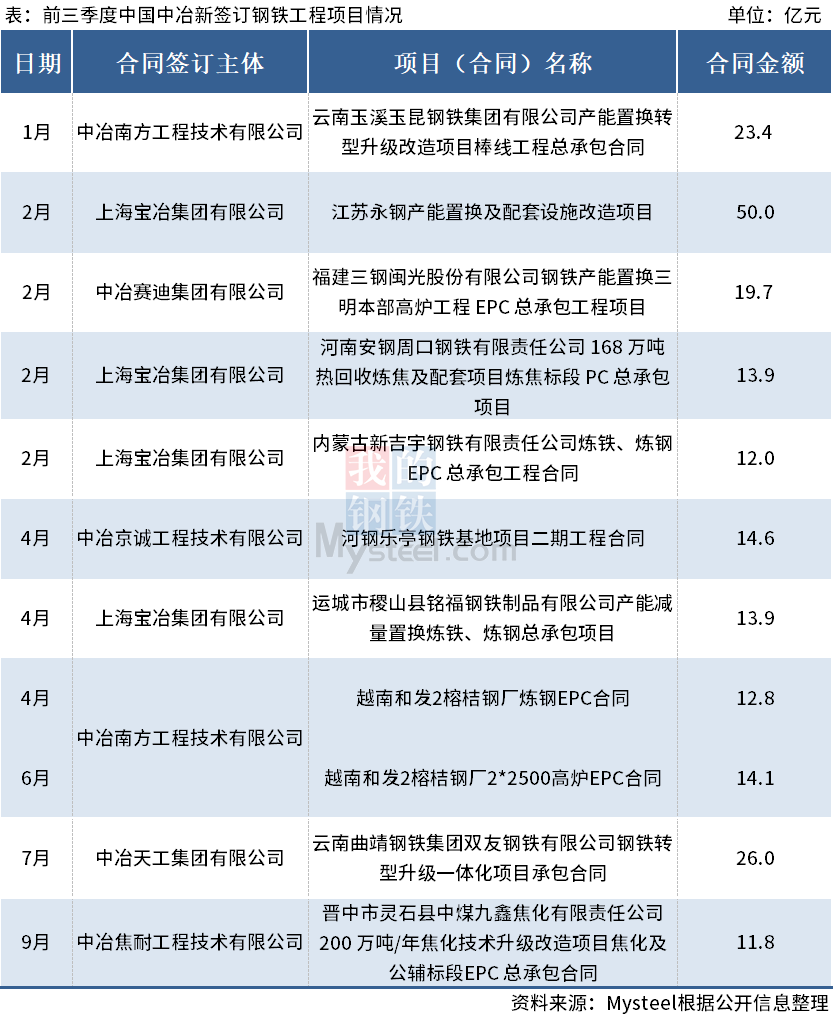 据中国中冶消息,2022年前三季度新签合同额人民币新签合同额人民币 9352.7 亿元,较上年同期增长 6.6%。其中10亿元以上的重大钢铁相关工程承包合同10个,合同金额212.2亿元,具体项目明细如下: