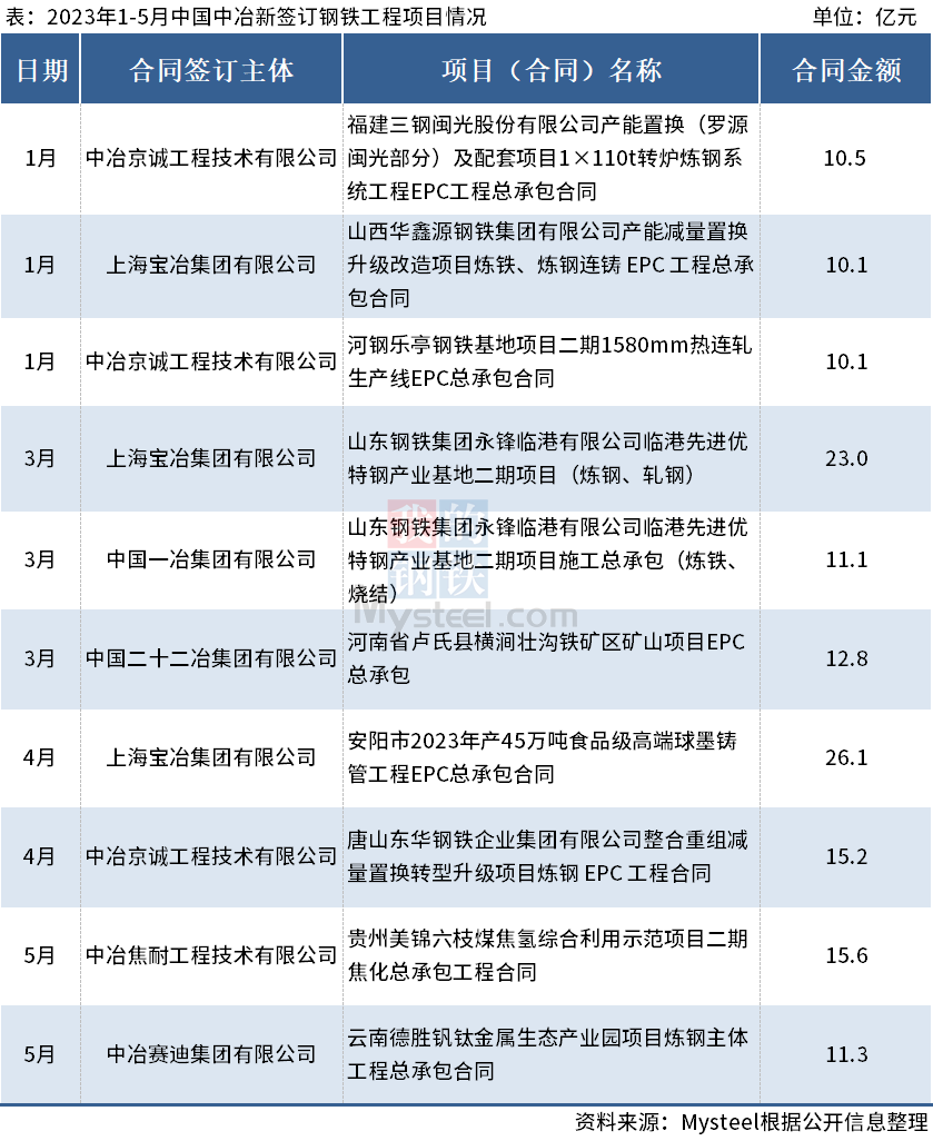 据中国中冶消息,2023年1-5月新签合同额人民币5398.1亿元,较上年同期增长8.1%。其中10亿元以上的重大钢铁相关工程承包合同10个,合同金额145.8亿元,具体项目明细如下: