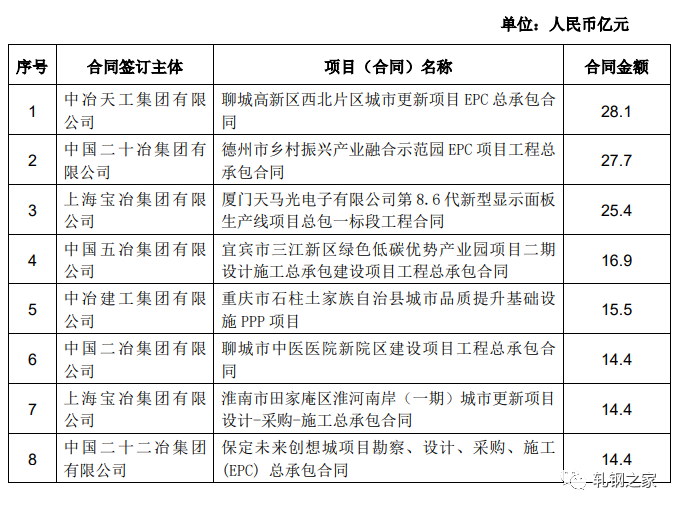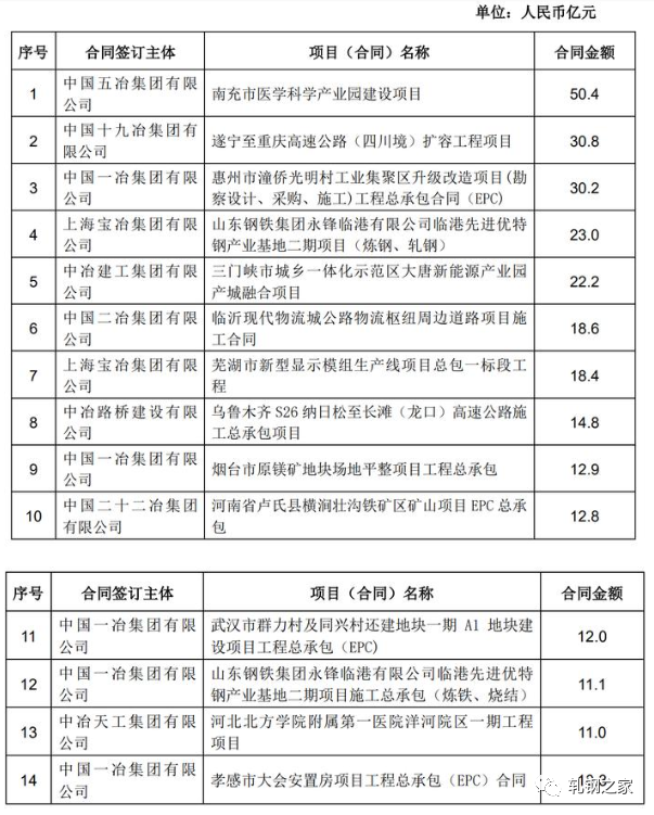 中国中冶5月新签单笔合同额在人民币10亿元以上的重大工程承包合同项目: