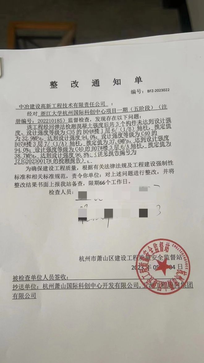 根据杭州市萧山区建设工程质量安全监督站(简称“萧山区质监站”)于2023年5月4日向施工方中冶建设高新工程技术有限责任公司(简称“中冶建设”)出具的《整改通知单》,经过对中冶建设承建的浙江大学杭州国际科创中心项目一期(五阶段)的监督检查,发现该工程经回弹法检测混凝土强度后,共有3个构件未达到设计强度。设计强度等级为C35的B04#楼1层6/(1/B)轴柱,工程推定値为32.9MPa,达到设计强度的94%。设计强度等级为C40的B07#楼3层7(1/A)轴柱,推定值为37.6MPa,达到设计强度的94%。设计强度等级为C40的B07#楼3层6/A轴柱,推定值为38.7MPa,达到设计强度的96.8%。