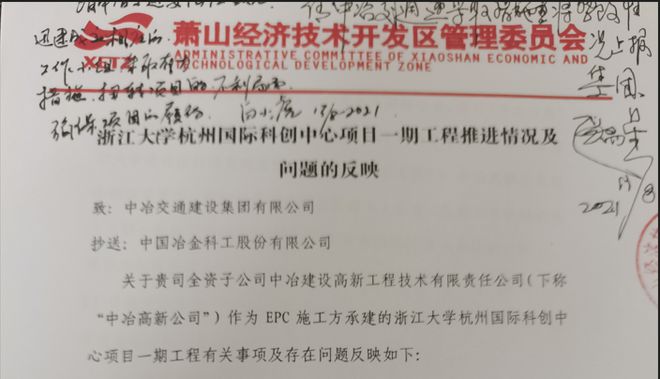 2021年8月9日,萧山经济技术开发区管委会专门给中冶建设的的上一级中冶交通发函并抄送中国中冶,提出项目存在三大问题:工期延误情况突出,在不断催促下中冶方面对项目的调配、管控、支持不够;安全管控不够,出现水泥罐倾覆、汽车侧翻、工人高出掉落等多起安全事故,现场应急处置能力差;没有全面管控工程质量。