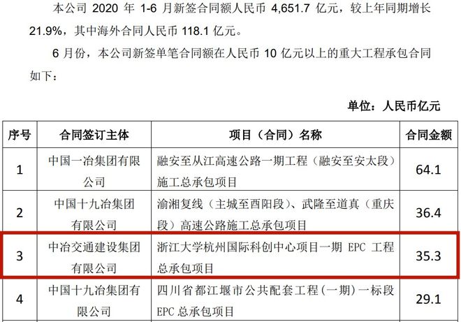 该项目全称“浙江大学杭州国际科创中心项目一期EPC工程”,由中国中冶旗下子公司中冶交通建设集团有限公司(简称“中冶交通”)中标。根据公告披露,中国中冶2020年上半年新签单笔合同额在人民币10亿元以上的重大工程承包合同共34个,该工程的合同金额排到第三。