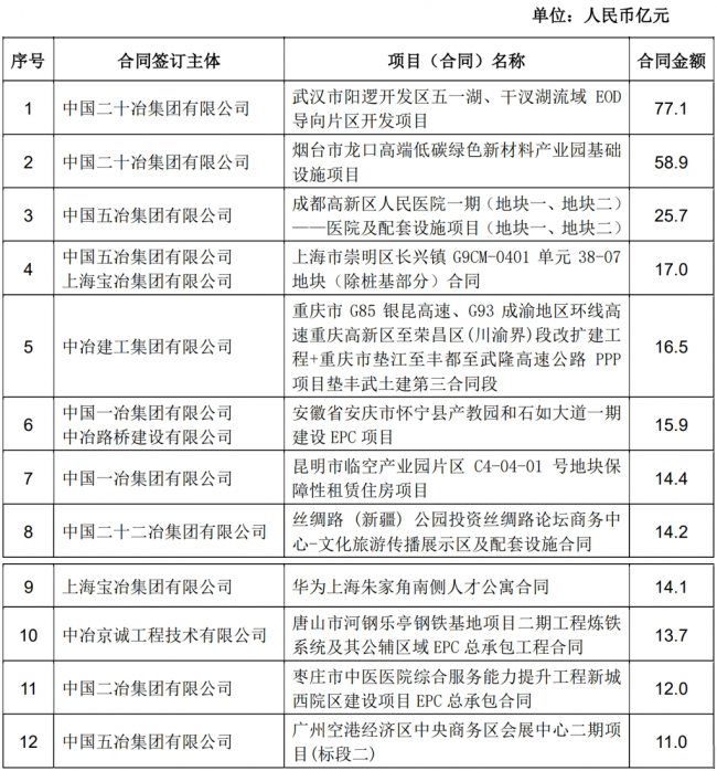 9月份,该公司新签单笔合同额在人民币10亿元以上的重大工程承包合同共12个,包括武汉市阳逻开发区五一湖、干汊湖流域EOD导向片区开发项目,昆明市临空产业园片区C4-04-01号地块保障性租赁住房项目,华为上海朱家角南侧人才公寓合同等。