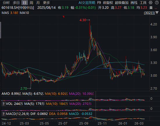与此同时,2025年的中国中冶股票在二级市场的表现,也是跌宕起伏、震荡加剧:从2025年初3.25元左右,先是跟随着有色金属板块整体强势上涨至2025年10月上旬最高时的4.3元,此后受到矿业资产、房开业务整体剥离的短暂冲击,股价小幅回调,至2025年年底报收于2.97元,全年仅微跌8.21%。