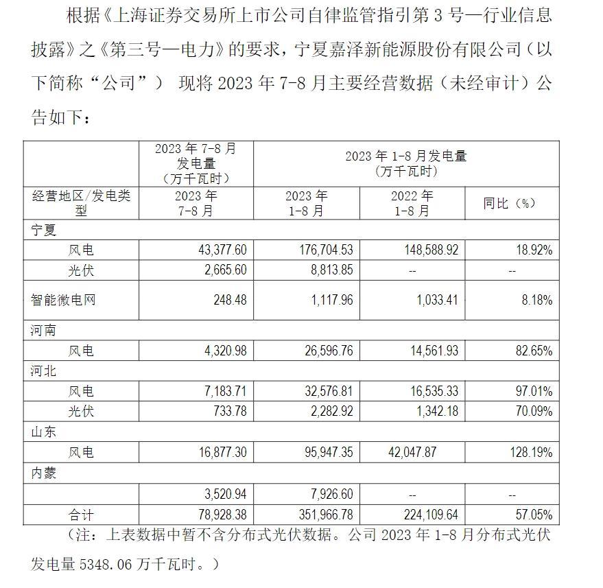 公告显示,不计入分布式光伏数据,嘉泽新能2023年7-8月共计发电78928.38万千瓦时,其中,宁夏、河北、河南、山东这四地的风电发电量为71759.59万千瓦时,占比为91%。