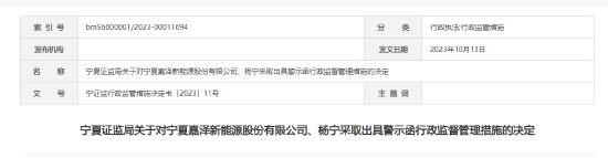 近日,宁夏证监局披露了《关于对宁夏嘉泽新能源股份有限公司、杨宁采取出具警示函行政监督管理措施的决定》的公告。