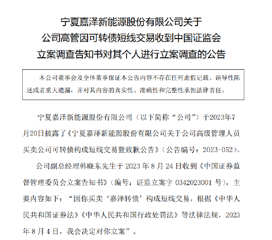 值得注意的是,今年八月,嘉泽新能还因公司副总经理韩晓东短线交易可转债被证监会立案调查,韩晓东本人也同时被立案。