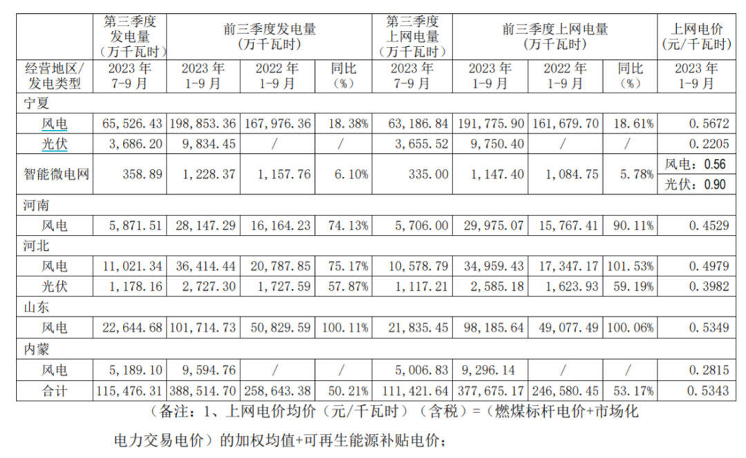 根据公司公告,2023年第三季度,公司实现发电量11.5亿千瓦时,同比增长9.9%,环比下降16.5%;公司实现上网电价加权均价0.5343元/千瓦时,相较于2022年前三季度的0.5486元/千瓦时同比下降0.0143元/千瓦时。对此,申银万国预计主因三季度风况较差,但是第三季度营收增长仅为3.92%,大幅低于发电量增速,预计补贴项目出售平价项目投产带来的电价下降是主要原因。
