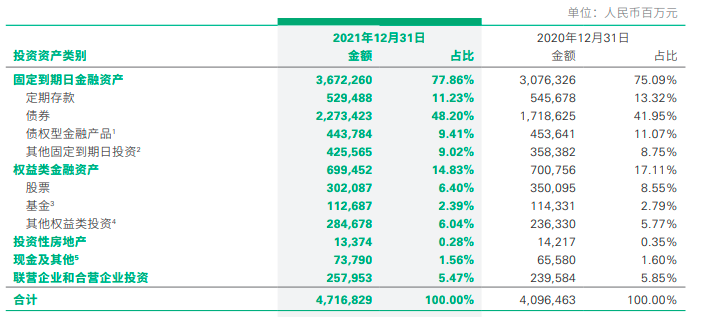 5月25日消息,据中国人寿(SH601628)2021年年报,截至本报告期末,中国人寿投资资产达47,168.29亿元,较2020年底增长15.1%。主要品种中债券配置比例由2020年底的41.95%提升至48.20%,定期存款配置比例由2020年底的13.32%变化至11.23%,债权型金融产品配置比例由2020年底的11.07%变化至9.41%,股票和基金(不包含货币市场基金)配置比例由2020年底的11.31%变化至8.75%。此外,投资性房地产金额为133.74亿元,占比0.28%。
