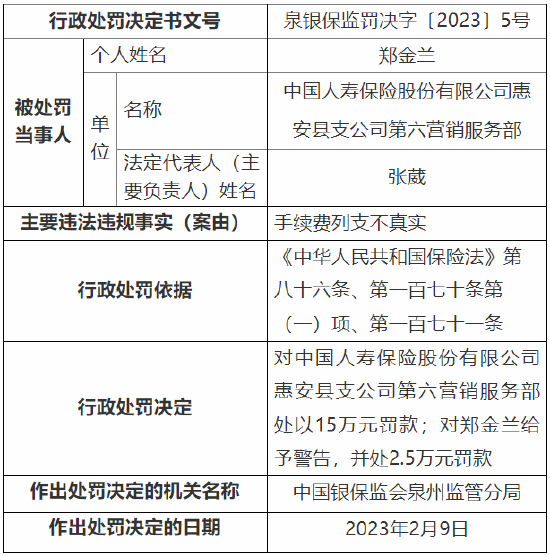 其中,中国人寿南安市支公司第十七营销服务部和中国人寿惠安县支公司第六营销服务部因手续费列支不真实,分别被监管罚款17万元和15万元。相关责任人王某某和郑某某分别被警告,并分别被罚款3万元、2.5万元。