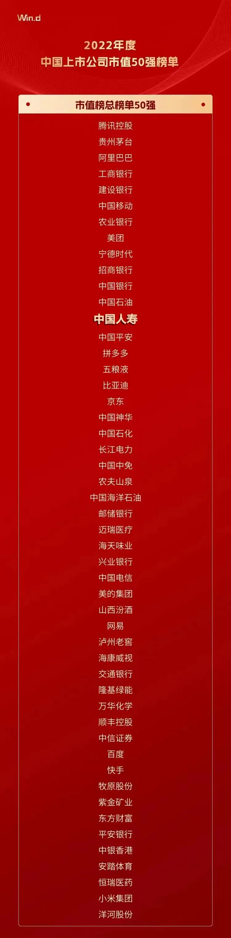 日前,国内领先的金融数据和分析工具服务商万得(Wind)公布2022年度中国上市公司市值50强榜单,中国人寿寿险公司位列第13名,为中国保险行业第一。此外,公司也荣登保险行业榜单5强首位。