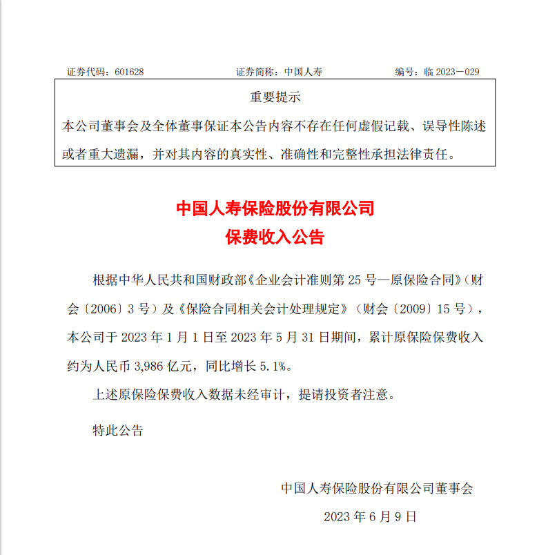 近日,中国人寿保险股份有限公司保费收入公告发布。公告显示,中国人寿保险股份有限公司于2023年1月1日至2023年5月31日期间累计原保险保费收入为人民币约3,986亿元,同比增长5.1%。