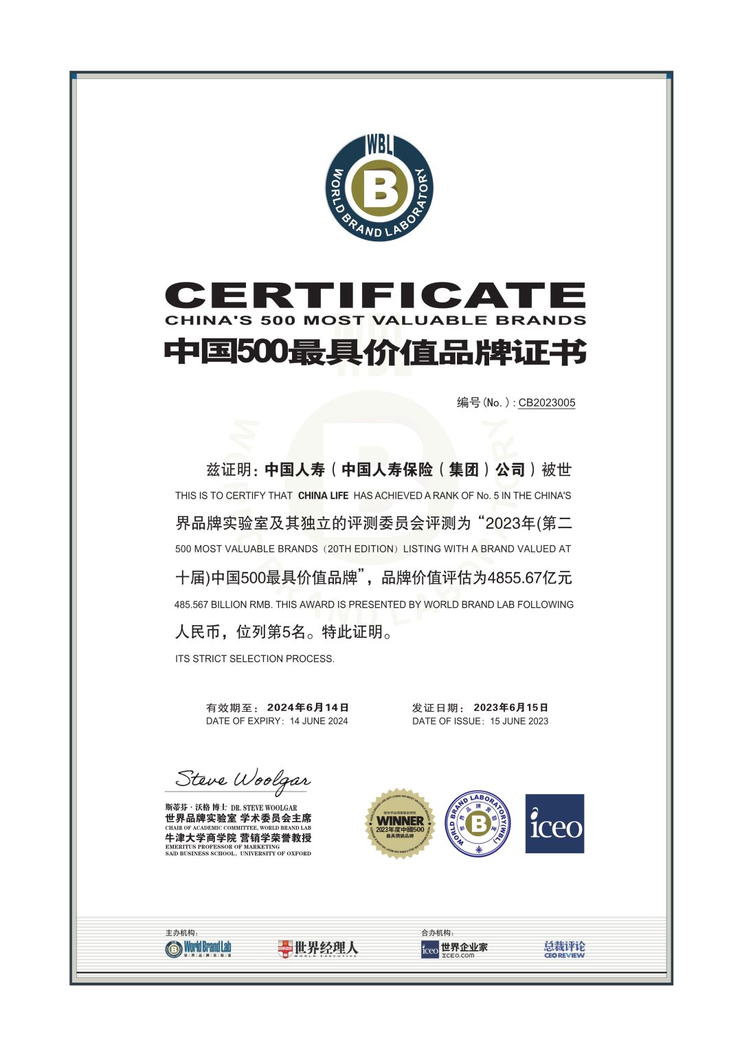 6月15日,世界品牌实验室发布2023年“中国500最具价值品牌”排行榜,中国人寿品牌继续位列第5位,品牌价值达人民币4855.67亿元,较2022年增加330.28亿元,在中国保险行业中蝉联第一。这是中国人寿连续第二十年入选“中国500最具价值品牌”排行榜,品牌价值较初次入选时上升4428亿元,品牌社会影响力和公信度持续扩大。