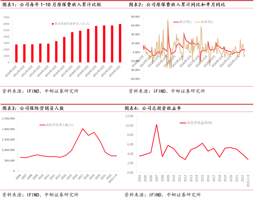 (1)公司保险业务重新实现较快发展:比较多年来1-10月份原保费收入,经过2021年保费收入增长减缓和2022年负增长之后,公司重新实现了较快增长,今年前10月累计增速4.1%。并于2、3、5、6月实现单月两位数的增速。前三季度,新单保费1966.56亿元,同比14.8%,首年期交保费1059.82亿元,同比16.0%,规模与增速均创近三年历史同期新高。(2)营销代理人改革近尾声,人员规模企稳。9月末,公司营销人员72万人,与年初相比仅下降9000人,与此前三年年均几十万人的减员相比,明显企稳。(3)队伍产能大幅提升,三季报显示,个险板块月人均首年期交保费同比28.6%。(4)投资承压,前3季度,总投资收益率仅为2.81%,为近10年最低。