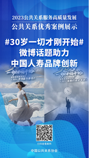 12月16日,2023年中国公共关系发展大会在京举办,本次大会聚焦“公共关系服务高质量发展”主题,由中国公共关系协会主办,中国上市公司协会、中国中小商业企业协会、五洲传播中心协办。新浪财经和中国人寿联合制作的#30岁一切才刚开始#微博话题活动,在120个案例中脱颖而出,入选“2023公共关系展示案例”。