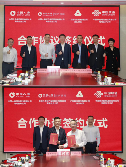 3月20日,中国人寿驻琼单位与中国联通海南省分公司在海口签署战略合作协议。海南省分公司党委书记、总经理李洪涛,党委委员、副总经理范文波;财险海南省分公司党委书记、总经理杨嘉,党委委员、副总经理陈刚;广发银行海口分行党委书记、行长龙炜,党委委员、副行长吴茵;联通海南省分公司党委书记、总经理谢华,党委委员、副总经理甘泉等领导出席签约仪式。
