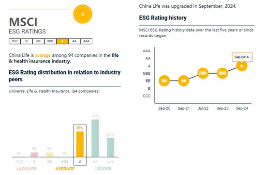 在ESG评级方面,MSCI ESG给中国人寿的评级在2024年9月升至A级,并获“卓越上市公司”等荣誉。