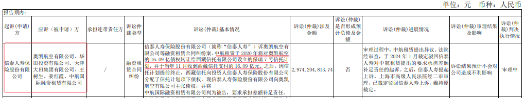 2023年,信泰人寿把中航产融旗下的中航国际融资租赁有限公司(中航租赁)告上法庭,要求承担连带责任。