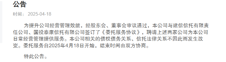 4月18日,中航信托发布公告,聘请建信信托、国投泰康信托为公司日常经营管理提供服务。中航信托成为中融信托、民生信托之后,第三家宣告“托管”的信托机构。