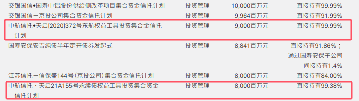 根据中国人寿年报,中国人寿还持有中航信托?天启[2020]372号东航权益工具投资集合金信托计划,金额90亿,中航信托?天启21A155号永续债权益工具投资集合资金信托计划,金额80亿。