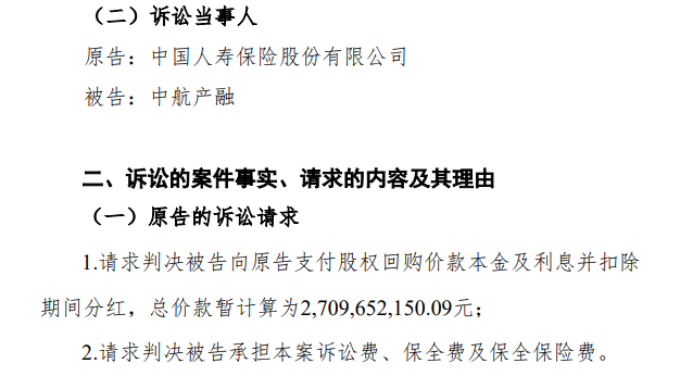 在中航产融退市前,中国人寿一纸诉状把中航产融送上了法庭,要求支付股权回购价款本金及利息并扣除期间分红,总价款暂计算为2,709,652,150.09元(约为27.1亿)。