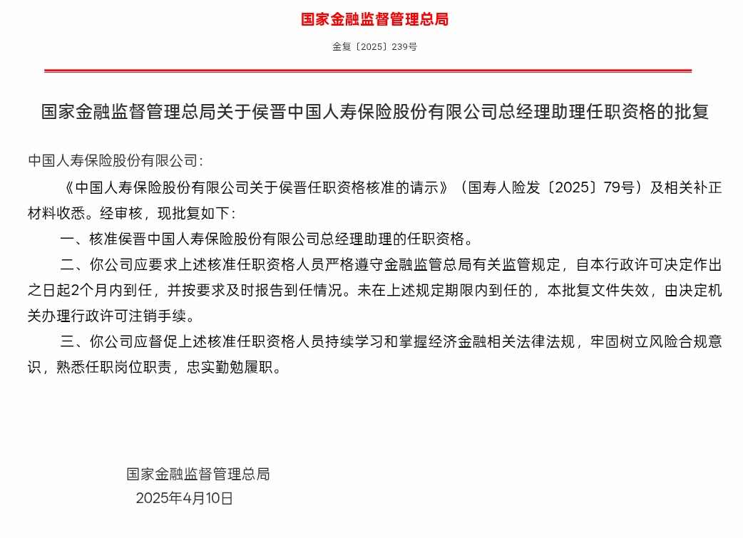 7月31日,国家金融监督管理总局发布关于侯晋中国人寿保险股份有限公司总经理助理任职资格的批复,核准侯晋中国人寿保险股份有限公司总经理助理的任职资格。