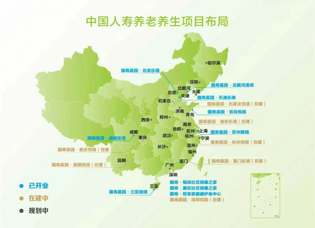 积极融入国家战略,推进重点区域养老项目布局。中国人寿在京津冀地区,推进北京乐境、石家庄悦境、北戴河逸境项目,与天津乐境串联形成京津冀养老服务一体化态势,为纾解压力、协同发展创造有利条件;在长三角地区,推进杭州悦境、南京项目,连同苏州雅境,初步形成了长三角地区养老项目储备;在成渝地区,推进重庆悦境项目,连同成都乐境项目,已完成成渝地区养老项目布局;在粤港澳大湾区,推进深圳悦境项目,积极储备广州项目。