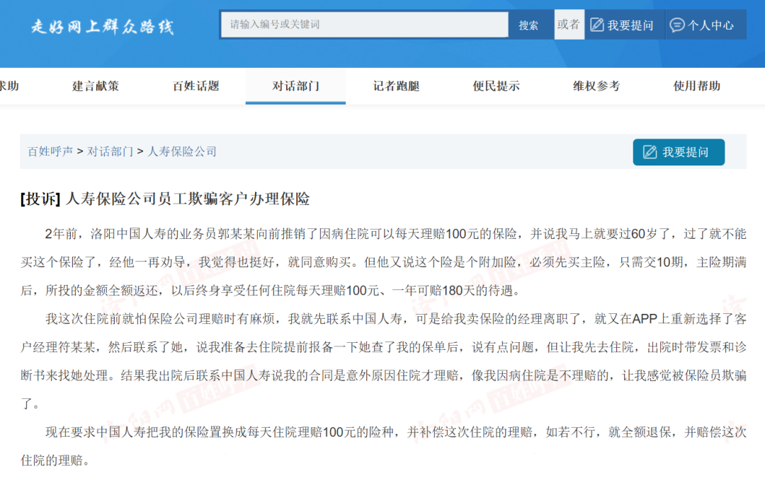在“洛阳百姓呼声”热线服务平台上,中国人寿洛阳分支机构多次被点名。2023年6月,市民刘敬华称,两年前,他通过中国人寿洛阳分公司的业务员郭某某购买了一份住院津贴保险。据其描述,郭某某当时明确表示,该产品可对“因病住院”提供每日100元的理赔,并强调其即将年满60岁,一旦超龄将无法投保,因此极力劝其尽快办理。