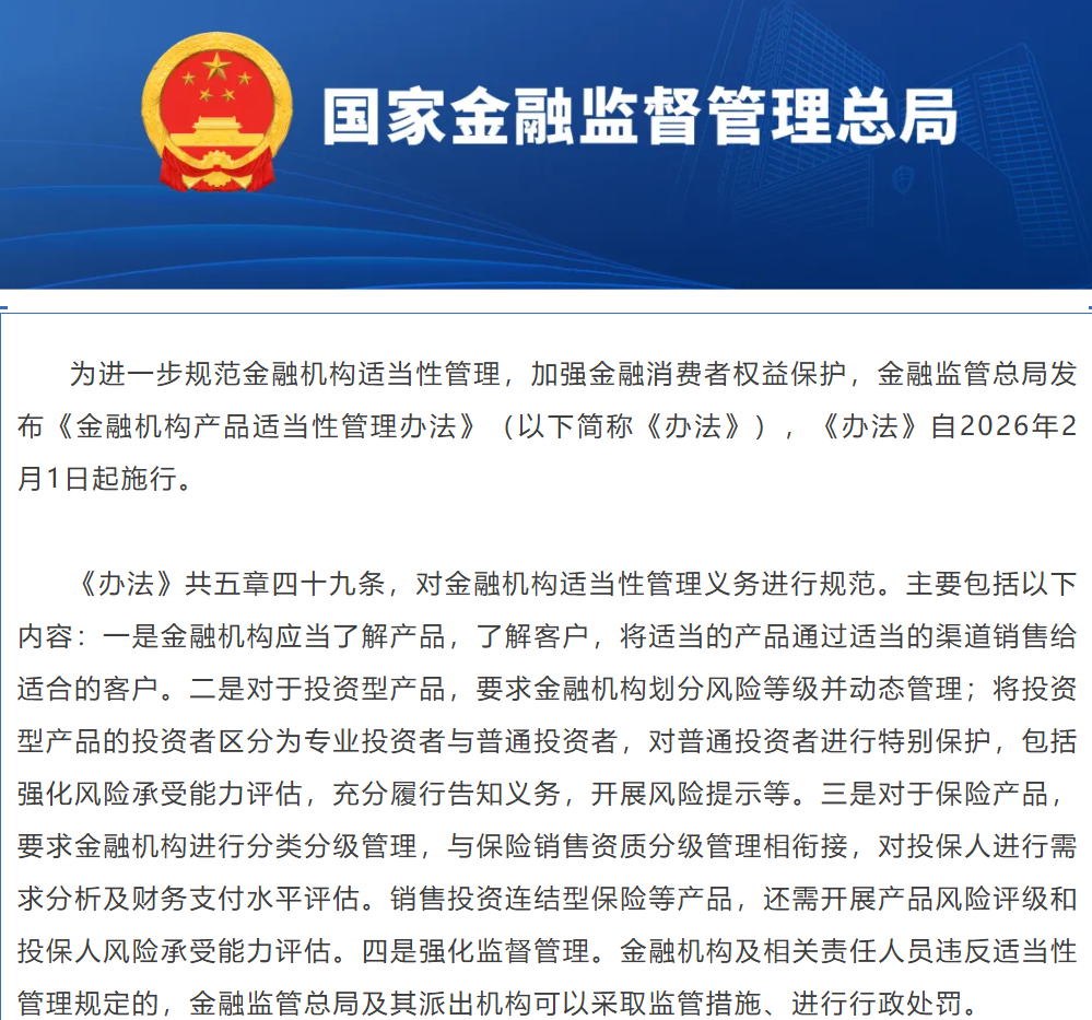 而就在这纸重罚没多久,一则新规正式实施。2月1日,《金融机构产品适当性管理办法》正式施行,标志着我国金融产品销售管理进入了系统化、规范化的新阶段,对金融机构和消费者都将产生深远影响。
