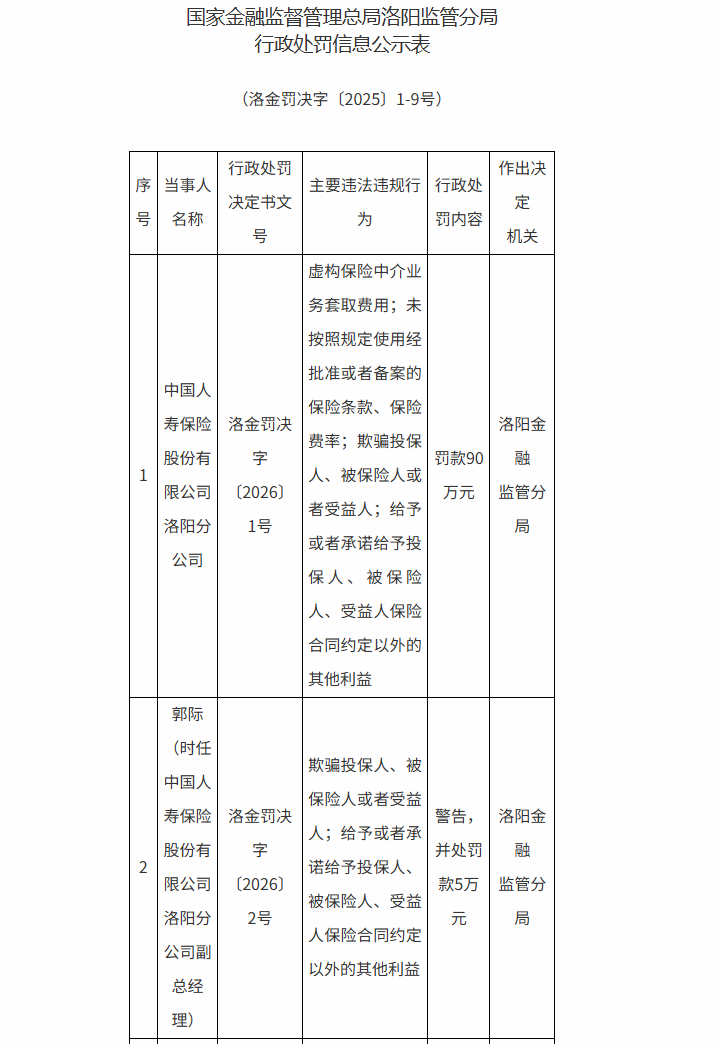1月30日,河南监管局洛阳分局公布行政处罚决定,对中国人寿在洛阳的三家分支机构及相关责任人开出重磅罚单。具体而言,中国人寿洛阳分公司因“虚构保险中介业务套取费用;未按照规定使用经批准或者备案的保险条款、保险费率;欺骗投保人、被保险人或者受益人;给予或者承诺给予投保人、被保险人、受益人保险合同约定以外的其他利益”四项违法违规行为,被处以罚款90万元。