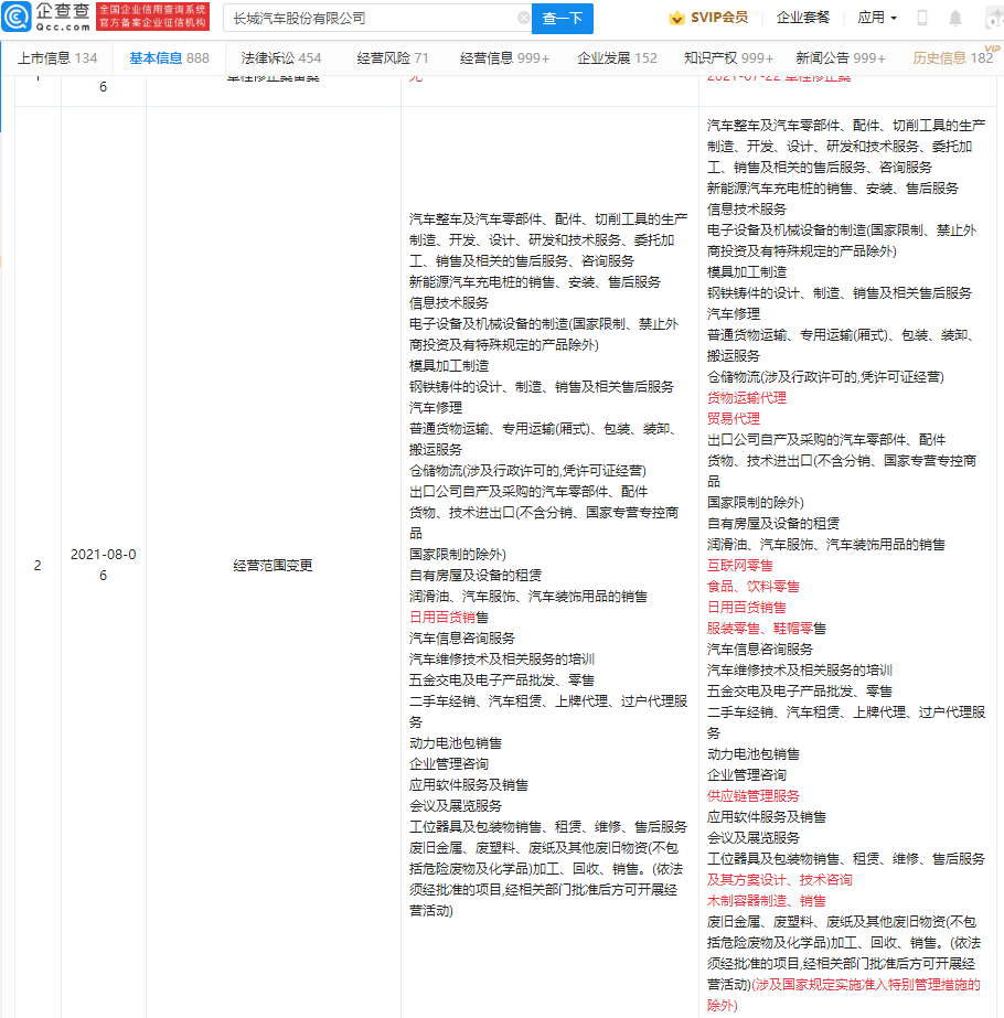 企查查APP显示,8月6日,长城汽车(601633)发生工商变更,公司经营范围新增互联网零售;食品、饮料零售;日用百货销售;服装零售、鞋帽零售;供应链管理服务等。