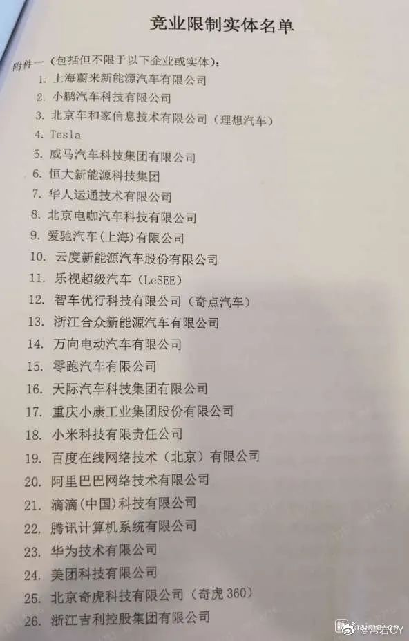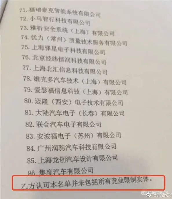 看到这份竞业限制名单之后,网友直呼:“签了这样的竞业限制协议,意味着就可以告别汽车行业了”、“名单中所列企业,几乎代表着中国汽车产业的中坚力量”。