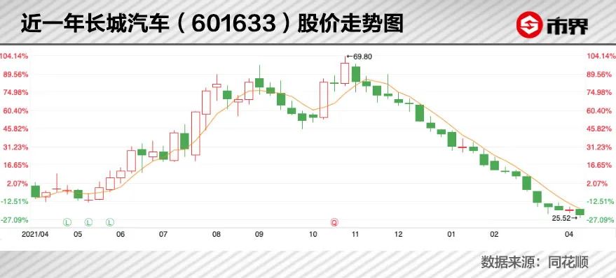 更高光的时刻出现在去年10月,长城汽车(601633)股价一度达到69.8元的历史高点,并使持股34.5%的魏建军,成为新任河北首富。可高光过后,长城汽车股价5个多月暴跌62%,市值蒸发超4000亿元,让魏建军损失1380亿身家。