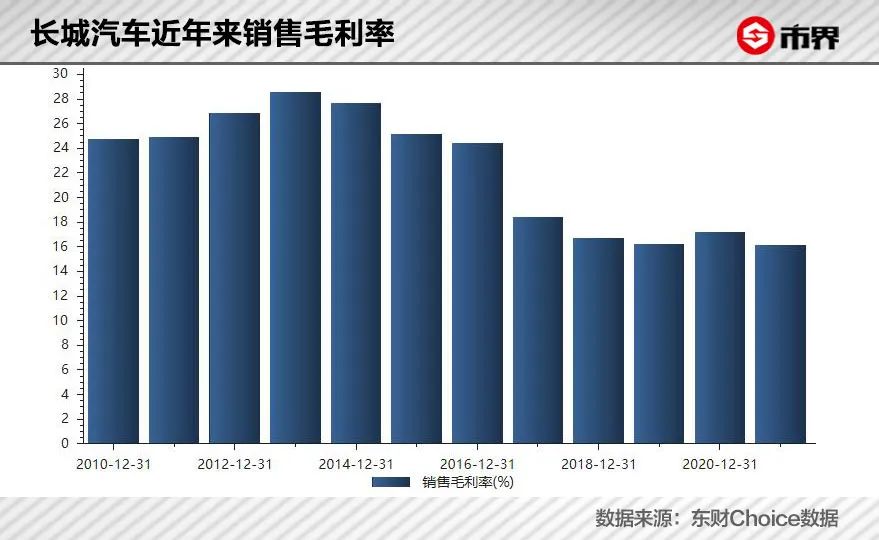 也是这一年开始,长城汽车的毛利率出现大幅度下滑,从24.46%跌至18.43%,至此正式告别20%毛利率时代,到2021年已跌至16.16%,再度刷新上市十几年来新低。