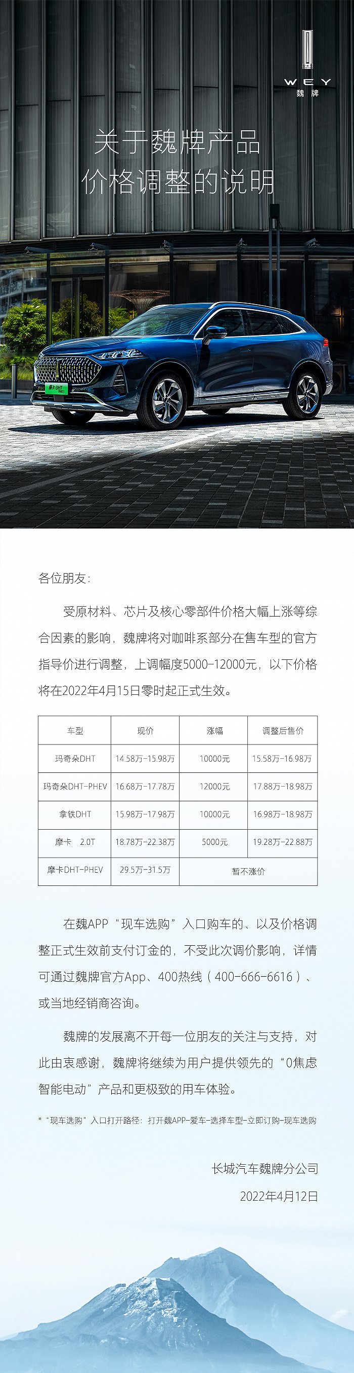 4月12日午间,长城汽车旗下魏牌官微发布发布关于魏牌产品价格调整的说明:受原材料、芯片及核心零部件价格大幅上涨等综合因素的影响,魏牌将对咖啡系部分在售车型的官方指导价进行调整,上调幅度5000-12000元,将在2022年4月15日零时起正式生效。