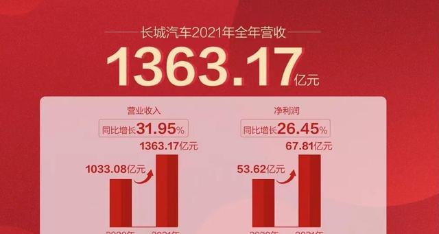 根据公司公布的财报,长城公司2021年度实现了1363.17亿元的营收,比上年同期增加31.95%,实现了67.81亿元的净利润,同比增加26.45%。长城在2019年实现了1033.08亿元的营业收入和53.62亿元的纯利润。从业绩上来看,长城的业绩比上年提高了不少。