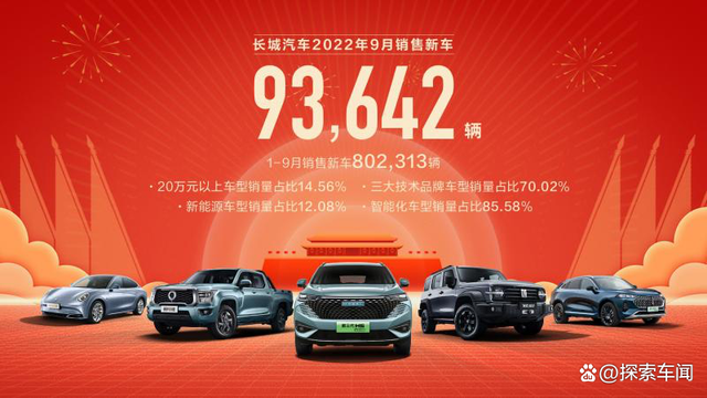 值得注意的是,今年1-9月份,长城汽车的新能源车型销售达到96,916辆,同比增长14.31%;智能化车型销量占比达85.58%,同比提升11%;三大技术品牌车型销量占比70.02%,同比提升12%;20万元以上车型销量占比达到14.56%,同比提升5%,全部实现了同比正增长。