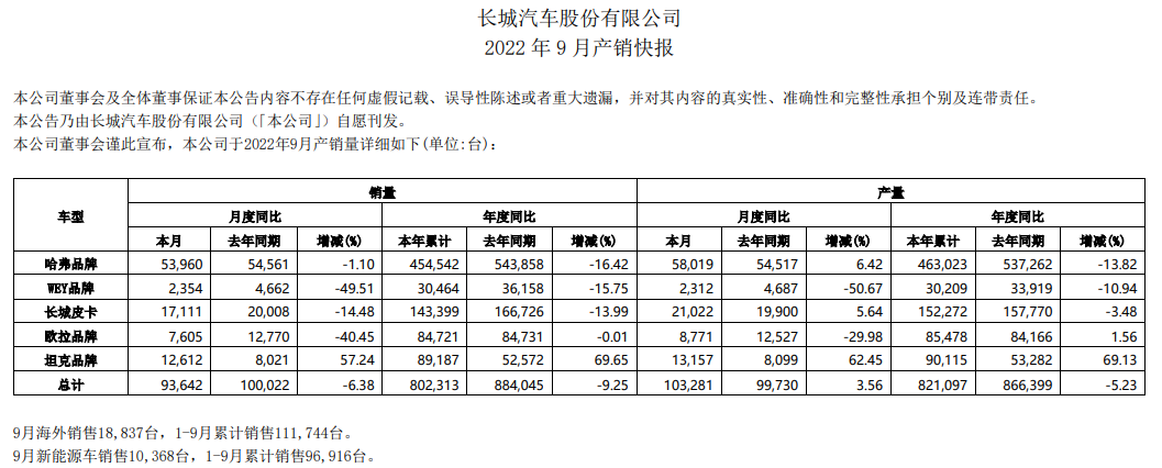 抱歉,杠杆游戏说了半天忘记了说总体。9月,长城汽车的总销量为93642辆,2021年同期有100022辆,同比下滑6.38%。