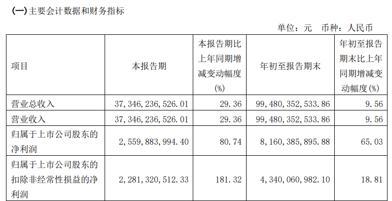 因此,前三季度下来,归母净利润为81.60亿元,同比增速也就低于二三季度,为65.03%——也不低哈。