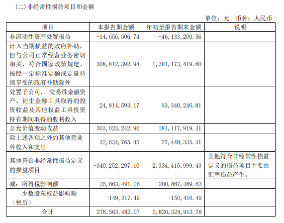 较大的金额方面,计入当期损益的政府补助(但与公司正常经营业务密切相关,符合国家政策规定、按照一定标准定额或定量持续享受的政府补助除外),三季度为3.09亿元,而前三季度该数字高达13.81亿元。