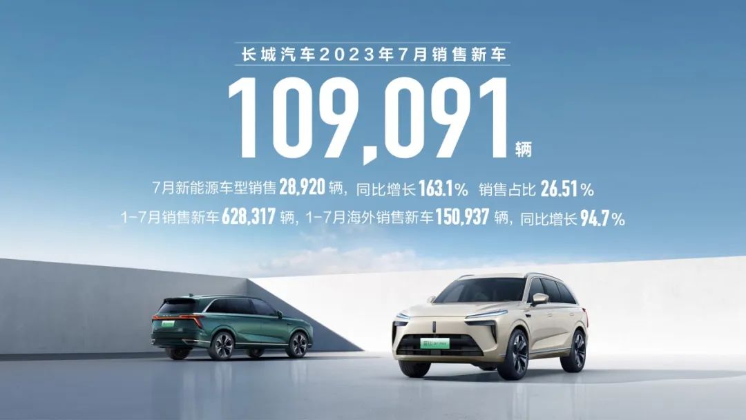 8月4日,长城汽车股份有限公司(股票代码:601633.SH,02333.HK;以下简称“长城汽车”)发布2023年7月产销数据。今年7月,长城汽车销售新车109,091辆,同比增长7.03%;新能源车型销售28,920辆,销售占比达26.51%,均创新高;海外销售27,007辆,同比增长83.60%,再创历史新高。