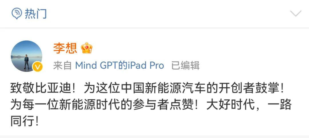 理想汽车董事长李想表示:“致敬比亚迪!为这位中国新能源汽车的开创者鼓掌!为每一位新能源时代的参与者点赞!大好时代,一路同行!”