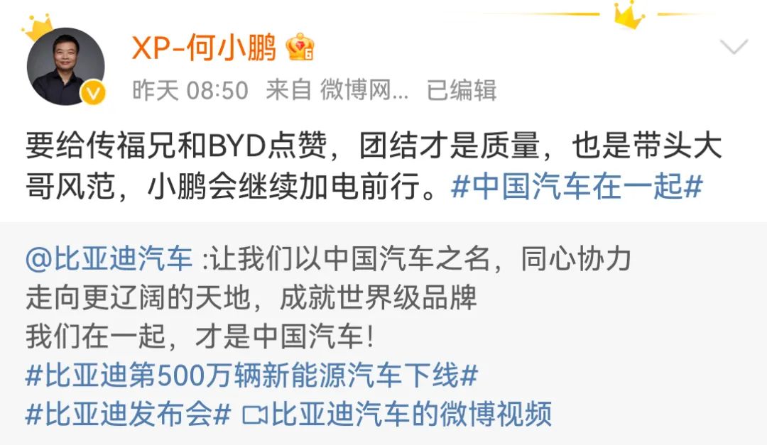 小鹏汽车董事长何小鹏在微博上,点赞王传福和比亚迪,并提到“团结才是质量,也是带头大哥风范”。