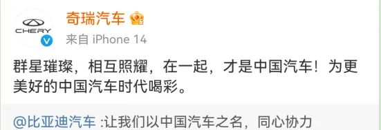奇瑞汽车在微博发文称:“群星璀璨,相互照耀,在一起,才是中国汽车!为更美好的中国汽车时代喝彩。”
