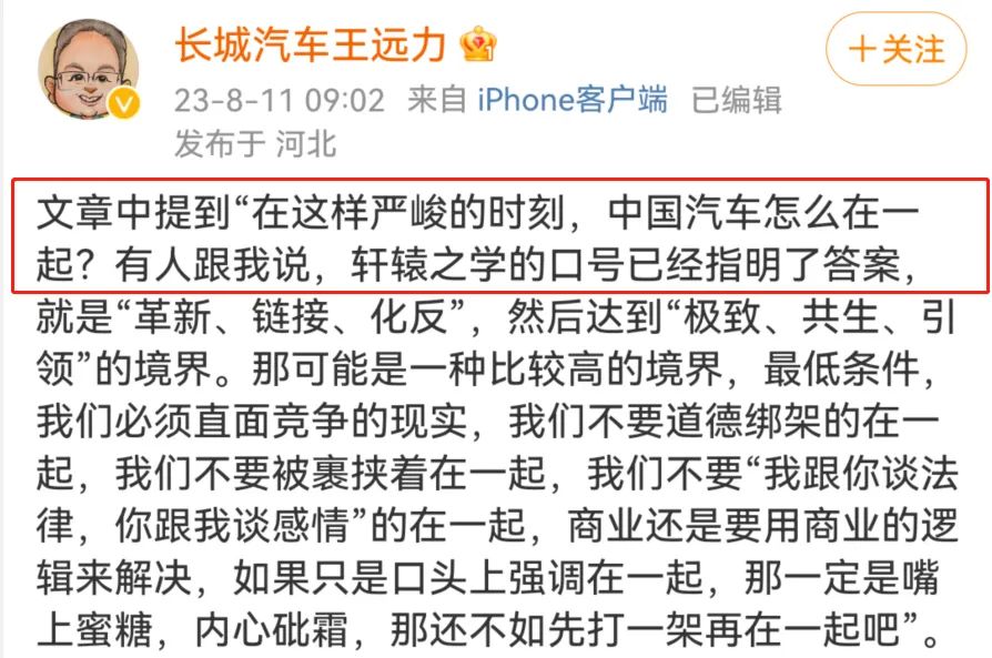 也有人提出异议。8月11日上午,微博认证长城汽车CTO王远力发布动态,疑似回应比亚迪上述口号称:“在这样严峻的时刻,中国汽车怎么在一起?”