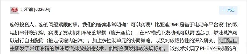 5月29日,比亚迪在互动平台多次表示:“比亚迪自主研发了常压油箱的燃油蒸汽排放控制技术,能符合蒸发排放法规标准。”