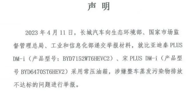 5月25日,长城汽车发表声明称,已向多部门递交举报材料,针对比亚迪秦PLUS DM-i、宋PLUS DM-i采用常压油箱,涉嫌整车蒸发污染物排放不达标的问题进行举报。