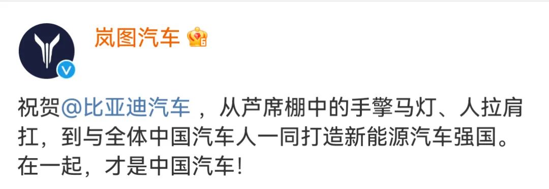 岚图汽车称:“从芦席棚中的手擎马灯、人拉肩扛,到与全体中国汽车人一同打造新能源汽车强国。”