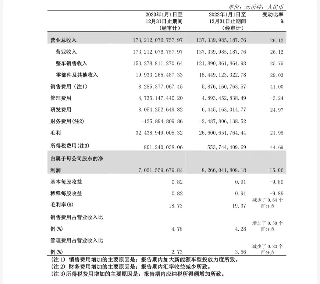 财报显示,2023年,长城营收为1732.12亿元,同比增长26.12%,其中整车销售收入为1532.79亿元,仍是公司主要收入来源,零部件及其余收入为199.33亿元。
